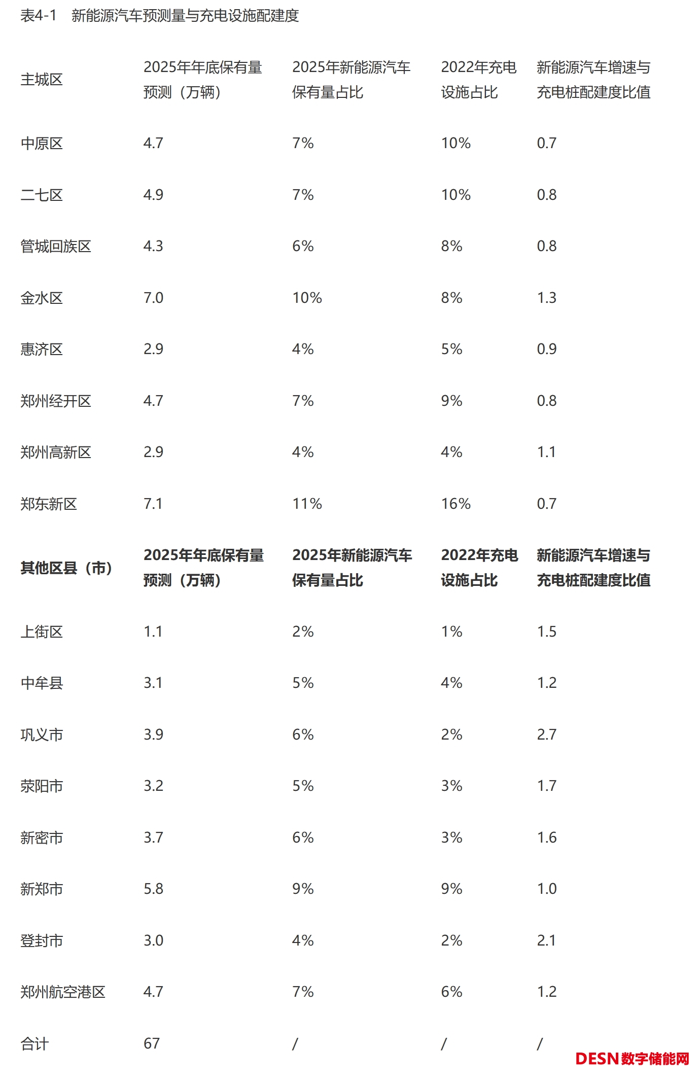 充電設(shè)施配建目標(biāo)需要充分考慮本區(qū)域汽車增長量和本區(qū)域公專用充電設(shè)施配建的成熟度。目前,鄭州市69%的公用充電設(shè)施分布在主城區(qū),中心城區(qū)公用充電設(shè)施建設(shè)密度已達(dá)25個/平方公里。周邊區(qū)縣(市)的充電設(shè)施主要集中在城內(nèi)建成區(qū)域,從充電站服務(wù)半徑考慮,仍有較大的補(bǔ)充空間。根據(jù)表4—1新能源汽車預(yù)測量與充電設(shè)施配建度比值,主城區(qū)的充電設(shè)施建設(shè)速度快于新能源汽車增速。因此,預(yù)測2025年各區(qū)縣(市)新建充電設(shè)施數(shù)量采用2025年新能源車保有量比例進(jìn)行計算更加合理。