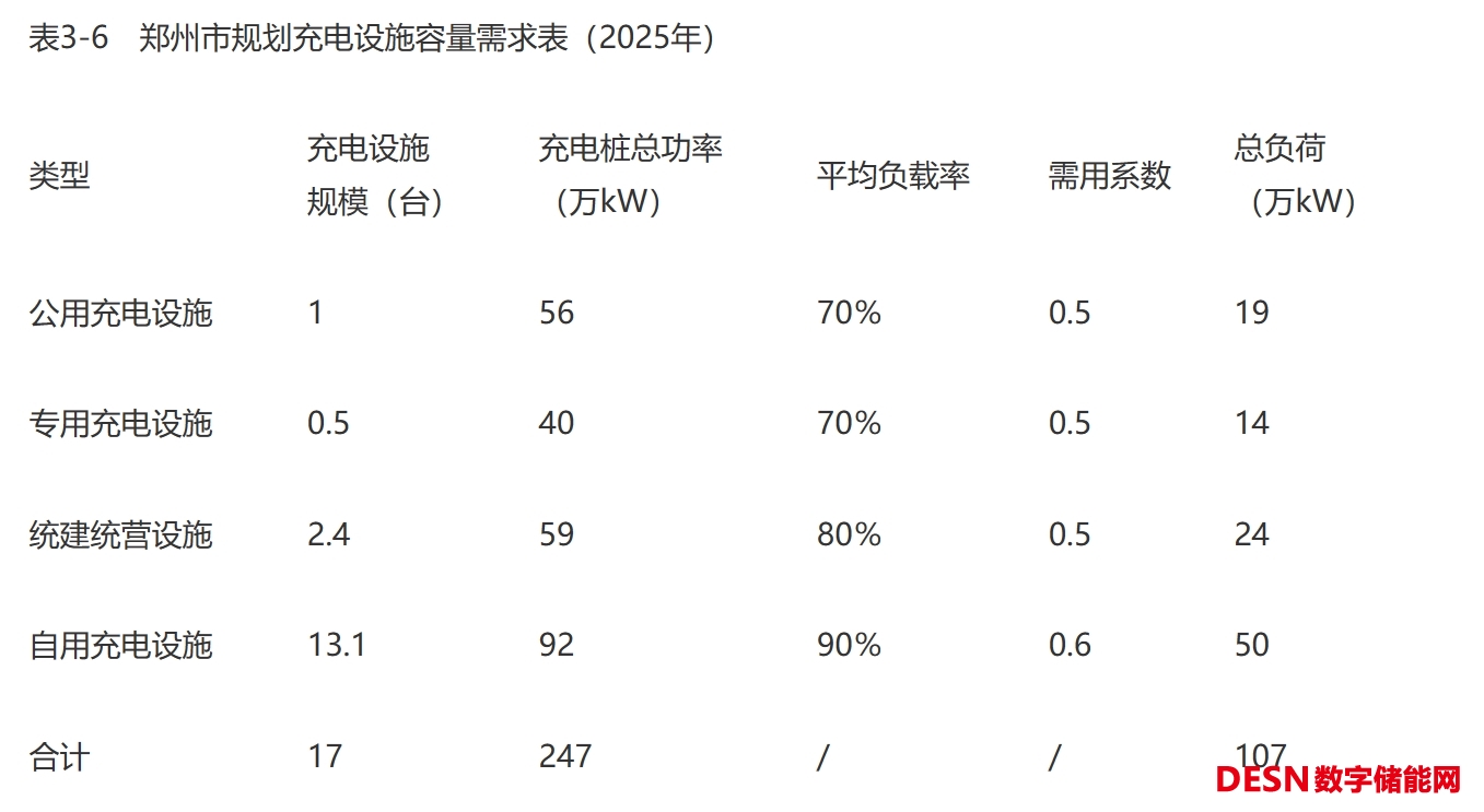 專用充電站直流充電設(shè)施按80kW/槍,公共充電站直流充電設(shè)施按80kW/槍,統(tǒng)建統(tǒng)營充電站直流充電設(shè)施按60kW/槍,自用交流樁按7kW/樁,其他交流樁按7kW/樁計算,規(guī)劃至2025年,鄭州市充電基礎(chǔ)設(shè)施總用電需求為107萬kW。