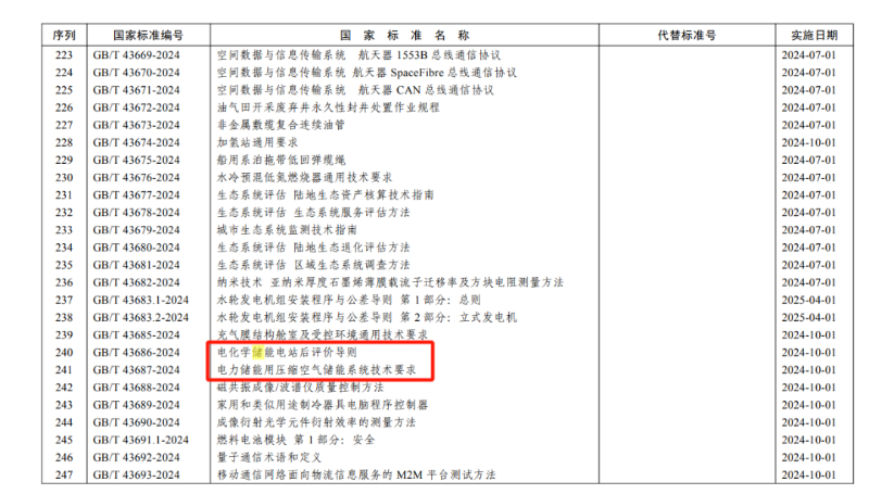 其中,2項(xiàng)儲能相關(guān)國家標(biāo)準(zhǔn)分別為《電化學(xué)儲能電站后評價導(dǎo)則》、《電力儲能用壓縮空氣儲能系統(tǒng)技術(shù)要求》,此外2項(xiàng)電池相關(guān)的國家標(biāo)準(zhǔn)分別為 《質(zhì)子交換膜燃料電池第6部分:雙板板特性測試方法》《鋰離子電池和電池組能源轉(zhuǎn)換效率要求和測量方法》,上述標(biāo)準(zhǔn)都將于2024年10月1日起實(shí)施。