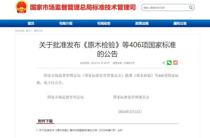 中國儲能網(wǎng)訊:3月15日,國家市場監(jiān)督管理總局(國家標(biāo)準(zhǔn)化管理委員會)批準(zhǔn)《原木檢驗(yàn)》等406項(xiàng)國家標(biāo)準(zhǔn)。