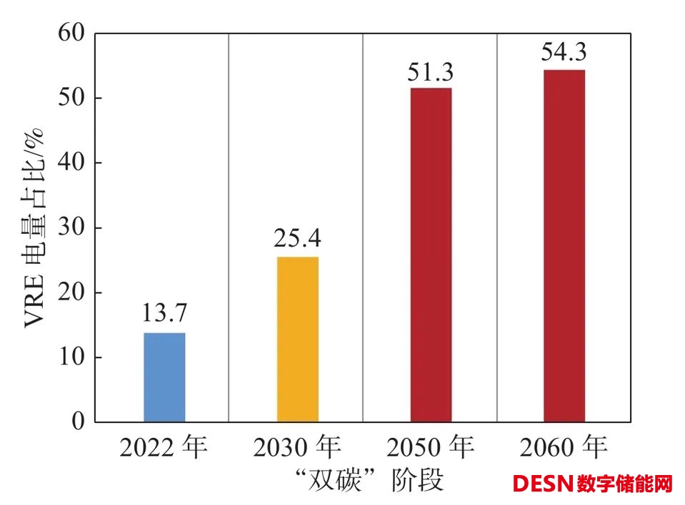 中國儲能網(wǎng)訊:新型電力系統(tǒng)是新型能源體系的重要組成和關(guān)鍵環(huán)節(jié)。據(jù)相關(guān)研究,中國能源電力雙碳實現(xiàn)路徑可分為碳達峰階段(當(dāng)前-2030年)、深度低碳階段(2030-2050年)和零碳階段(2050-2060年)3個階段。各個階段的VRE(Variable Renewable Energy,可變可再生能源)發(fā)電量占比預(yù)計分別為:碳達峰階段2030年為25.4%,深度低碳階段2050年為51.3%,零碳階段2060年為54.3%。