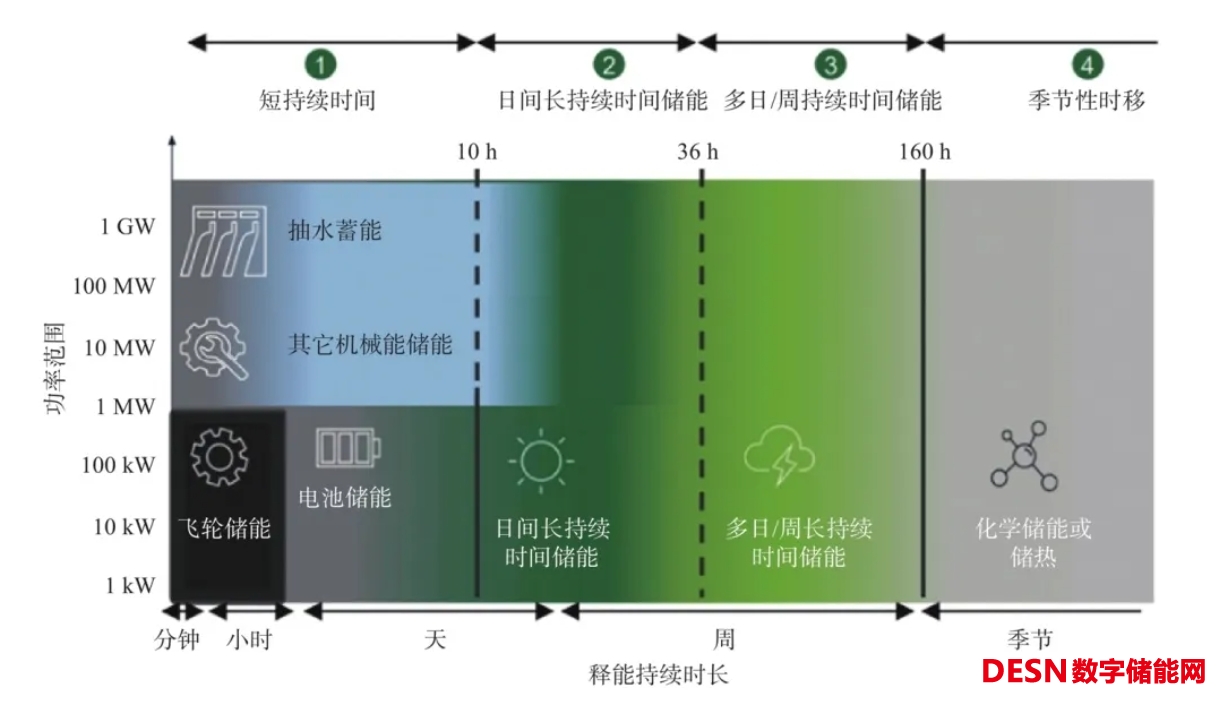 時間尺度長短是相對的,短持續(xù)時間儲能和長持續(xù)時間儲能的時間界限,當(dāng)前國際上尚無統(tǒng)一標(biāo)準(zhǔn)。歐洲一些學(xué)者及機構(gòu)將小時級以上界定為長持續(xù)時間儲能,國際LDES(長持續(xù)時間儲能)委員會將6~8小時-150小時界定為LDES,美國加利福尼亞公共事業(yè)委員會(CPUC)要求為8小時及以上,美國能源部則要求10小時及以上,還有的機構(gòu)要求一天及以上水平(24~72小時)、周水平(100小時),甚至季節(jié)水平。