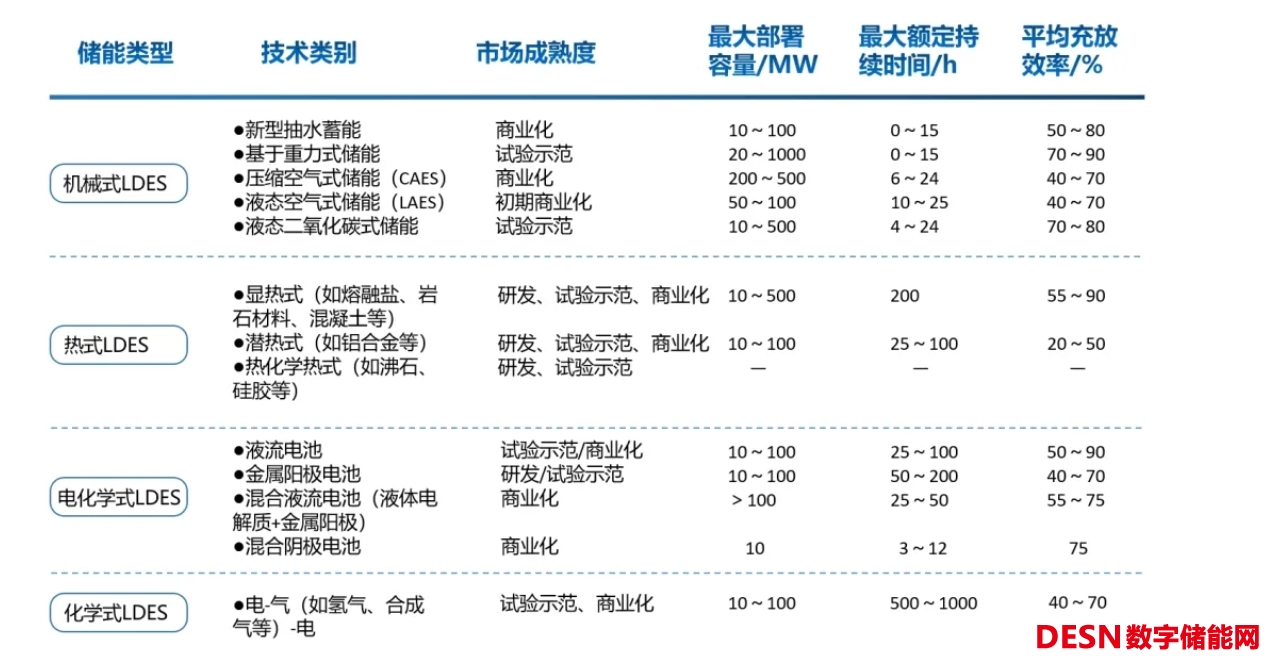 ↑ 各類長持續(xù)時間儲能技術(shù)主要參數(shù)及市場成熟度