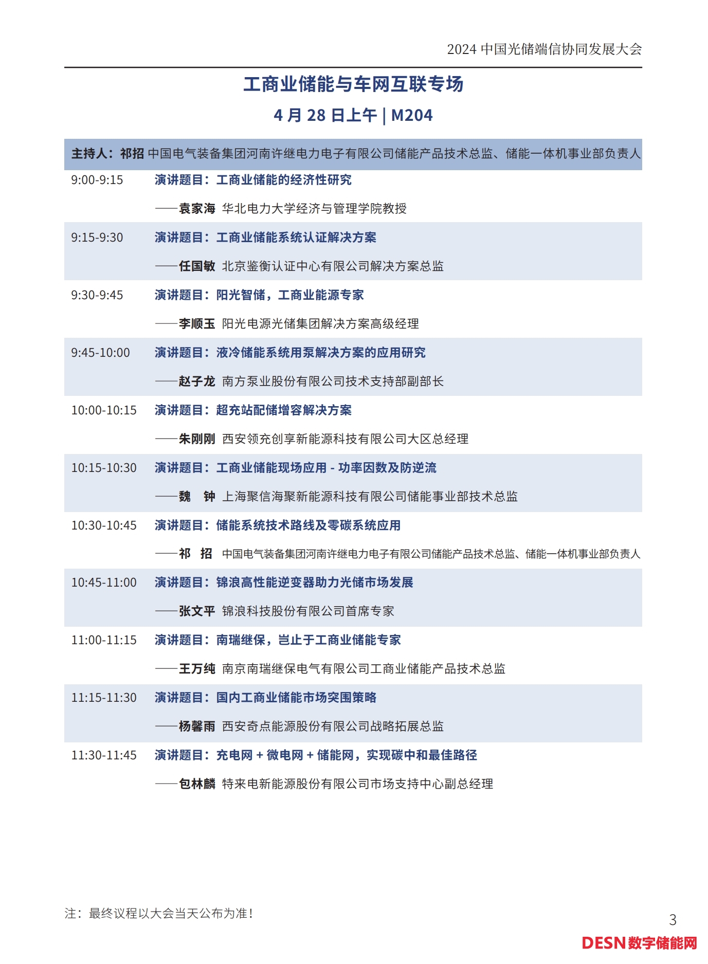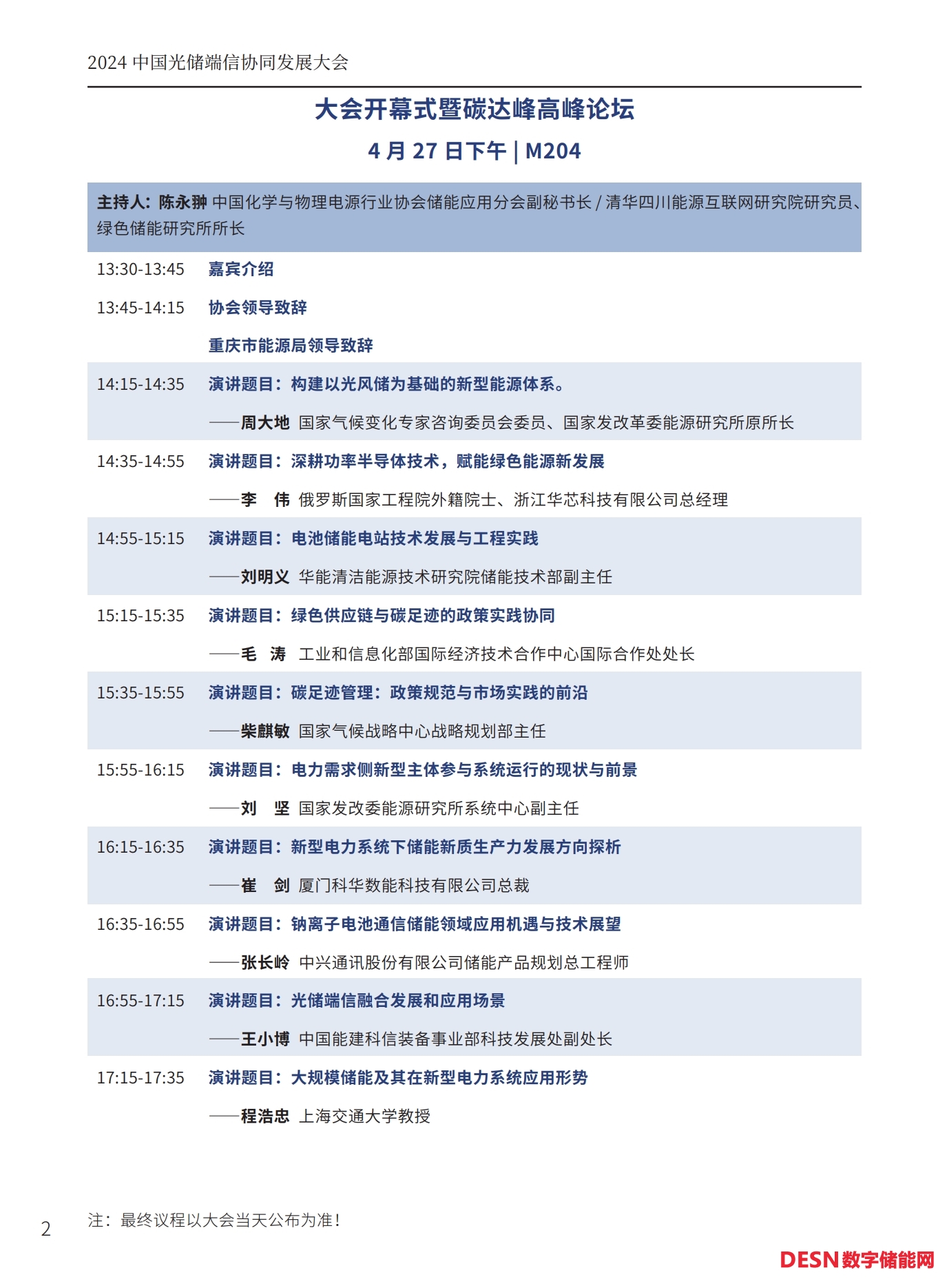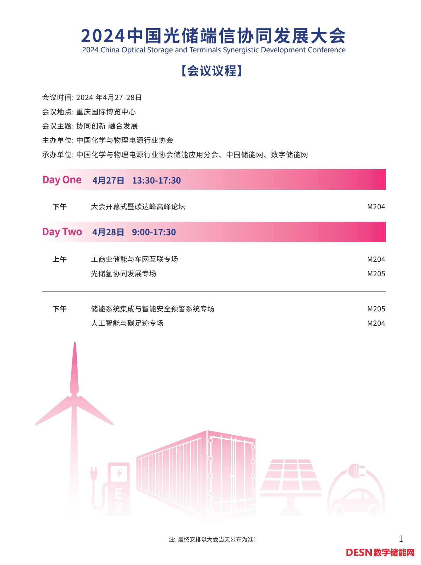 本屆大會將安排:大會開幕式暨碳達峰高峰論壇、工商業(yè)儲能與車網(wǎng)互聯(lián)專場、光儲氫協(xié)同發(fā)展專場、儲能系統(tǒng)集成與智能安全預警系統(tǒng)專場、人工智能與碳足跡專場等五個專場論壇。以下為本次大會主要議程(最終議程以活動當天公布為準)。