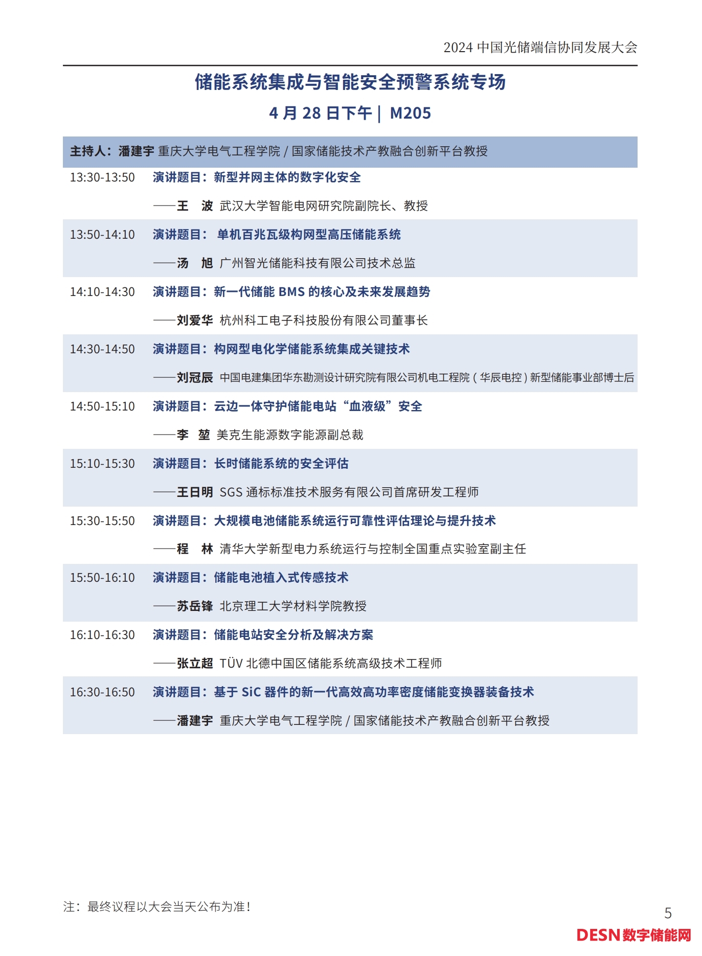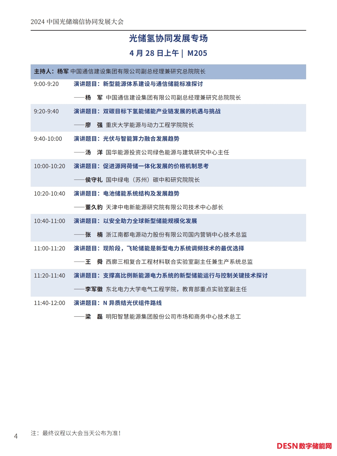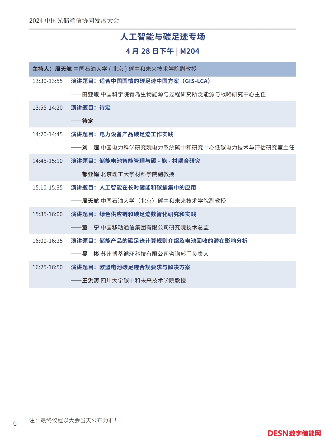 本屆大會將安排:大會開幕式暨碳達峰高峰論壇、工商業(yè)儲能與車網(wǎng)互聯(lián)專場、光儲氫協(xié)同發(fā)展專場、儲能系統(tǒng)集成與智能安全預警系統(tǒng)專場、人工智能與碳足跡專場等五個專場論壇。以下為本次大會主要議程(最終議程以活動當天公布為準)。