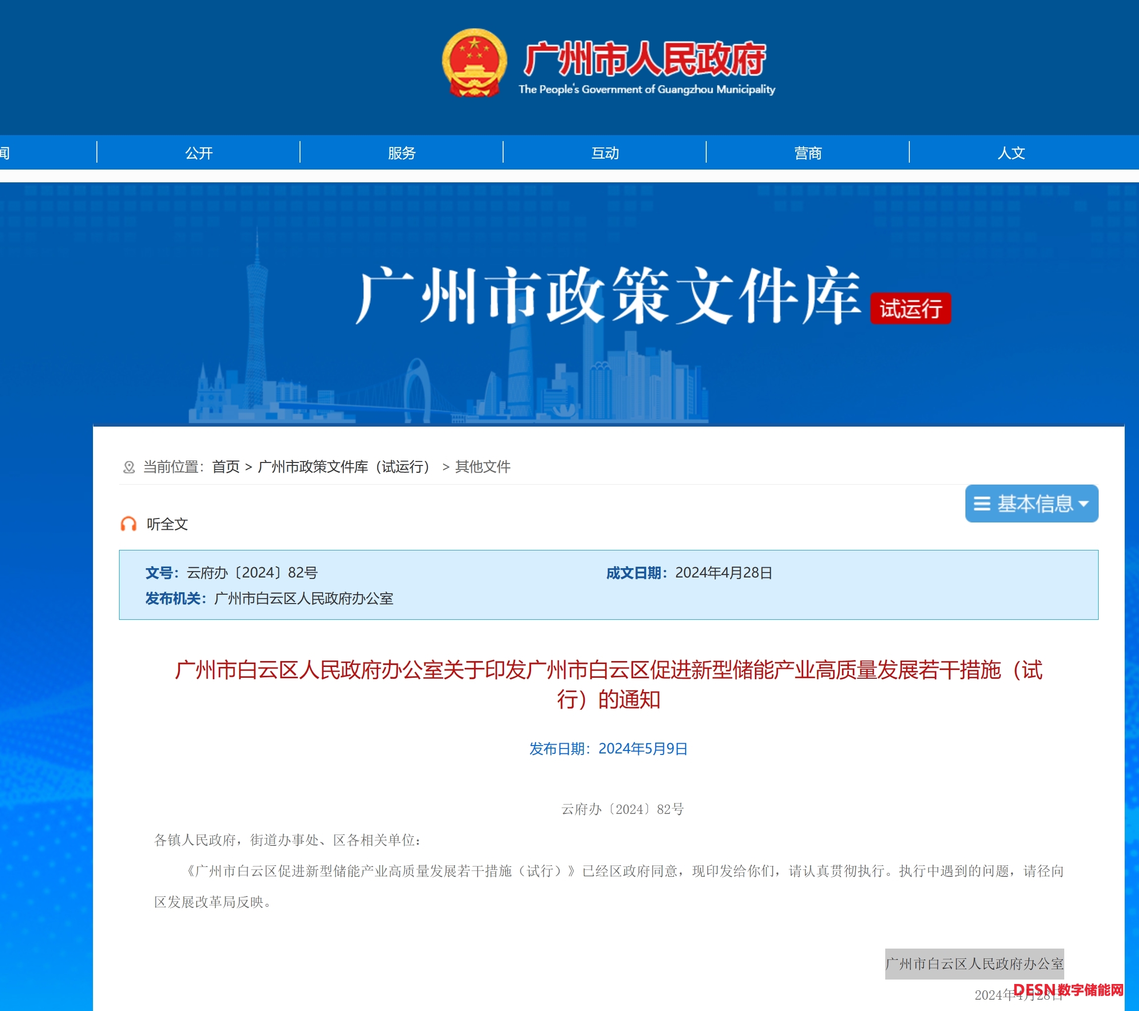 廣州市白云區(qū)人民政府辦公室關于印發(fā)廣州市白云區(qū)促進新型儲能產業(yè)高質量發(fā)展若干措施(試行)的通知