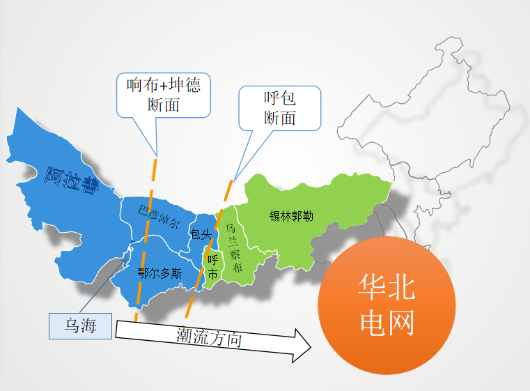 圖2蒙西電網(wǎng)斷面及潮流方向示意圖