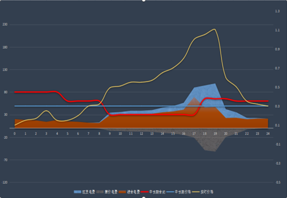 如圖3所示,在部分時間內(nèi),阻塞斷面內(nèi)的電源在承受較低現(xiàn)貨價格的同時,還要向參考結算點價格高于合同價的用戶支付價差電費,極端情況下,電源現(xiàn)貨電費(藍色面積)甚至小于價差電費(灰色面積),最終形成了負結算電費(紅色面積),當然這種情況在大烏海區(qū)域出現(xiàn)的不多,更多的表現(xiàn)為收入降低