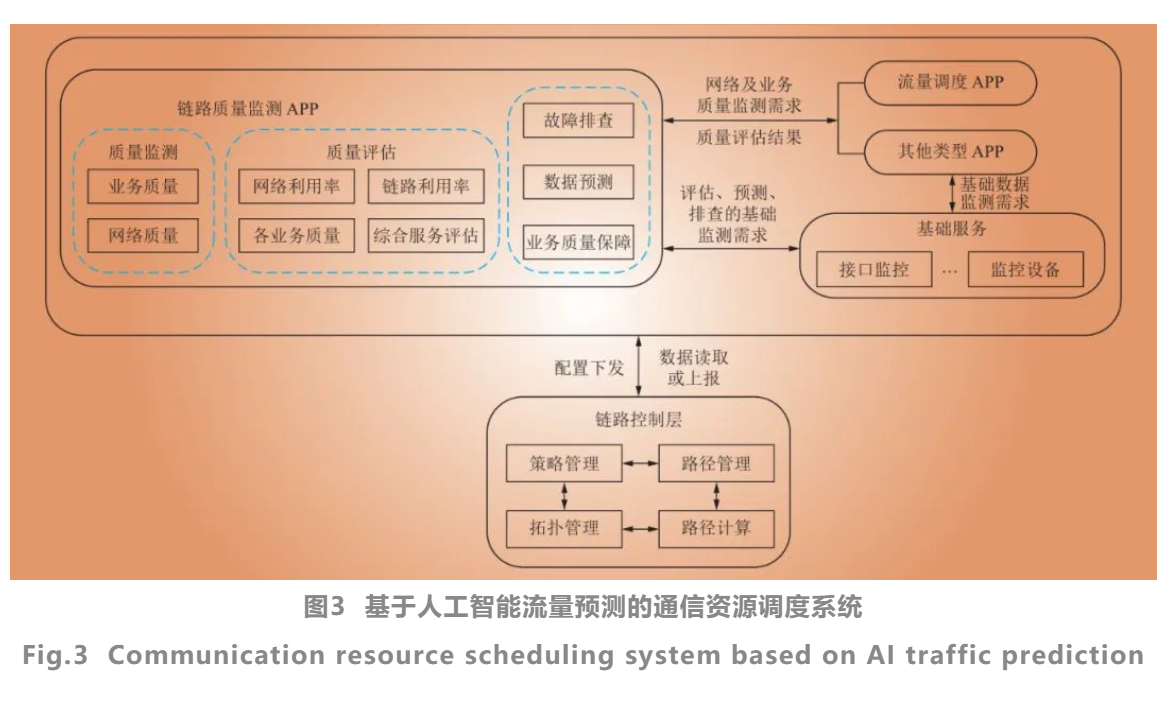 在資源層,面對(duì)協(xié)議復(fù)雜多樣、不同廠(chǎng)家網(wǎng)管難以兼容、跨域跨網(wǎng)業(yè)務(wù)QoS保障等問(wèn)題,對(duì)統(tǒng)一資源調(diào)度的能力、可靠性提出了更高的要求。上海市電力公司開(kāi)展通信資源智能調(diào)度系統(tǒng)部署,如圖3所示。該系統(tǒng)向下屏蔽不同廠(chǎng)家控制器的差異,向上將用戶(hù)需求翻譯成控制器可以理解的策略并下發(fā)執(zhí)行,同時(shí)引入基于人工智能的流量預(yù)測(cè)算法,提升資源調(diào)度的準(zhǔn)確性,使業(yè)務(wù)保障方式變得按需靈活。配置指令數(shù)量從原有的成百上千條精簡(jiǎn)到現(xiàn)有的20條以下,新業(yè)務(wù)的上線(xiàn)時(shí)間從原來(lái)的小時(shí)級(jí)、天數(shù)級(jí)縮短到現(xiàn)在的分鐘級(jí),真正實(shí)現(xiàn)電力通信網(wǎng)“一鍵指配”,按需保障業(yè)務(wù)端到端服務(wù)質(zhì)量。