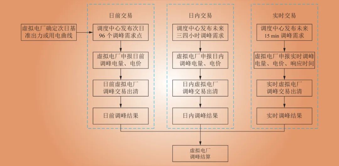 交易流程由虛擬電廠(chǎng)交易、調(diào)度中心、交易中心、營(yíng)銷(xiāo)部、財(cái)務(wù)部、虛擬電廠(chǎng)管理平臺(tái)、虛擬電廠(chǎng)、終端用戶(hù)共同參與,協(xié)調(diào)開(kāi)展。調(diào)度中心負(fù)責(zé)提出調(diào)度需求;交易中心負(fù)責(zé)發(fā)布需求并進(jìn)行市場(chǎng)出清以及結(jié)算出清結(jié)果;虛擬電廠(chǎng)管理平臺(tái)記錄虛擬電廠(chǎng)響應(yīng)情況;財(cái)務(wù)部門(mén)負(fù)責(zé)結(jié)算響應(yīng)結(jié)果;虛擬電廠(chǎng)則是組織終端用戶(hù)參與市場(chǎng)申報(bào);終端用戶(hù)執(zhí)行出清結(jié)果。