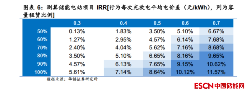 (4)容量補(bǔ)償:山東儲(chǔ)能可獲得容量補(bǔ)償,在容量市場運(yùn)行前,電價(jià)標(biāo)準(zhǔn)暫定為 0.0991 元/kWh,向市場化用戶收?。粌?chǔ)能日發(fā)電可用容量=(儲(chǔ)能電站核定充電容量/2)*日可用等效小時(shí)數(shù)/24,示范項(xiàng)目按 2 倍標(biāo)準(zhǔn)執(zhí)行。假設(shè) 100MW/200MWh項(xiàng)目,示范項(xiàng)目可用為(200/2) *2/24*2=100/6MW。2022年山東交易電量 3800億kWh,發(fā)電裝機(jī) 189.58GW,根據(jù)此數(shù)據(jù)和容量補(bǔ)償計(jì)算規(guī)則, 100MW/200MWh項(xiàng)目一年可獲得的容量補(bǔ)償為 331.07 萬元。我們假設(shè) 100MW/200MWh 儲(chǔ)能項(xiàng)目:(1)造價(jià) 1.8 元/Wh,(2)全年充放電次數(shù) 270 次,充放電平均電價(jià)差 0.50 元/kWh,(3)租賃價(jià)格 150 元/kWh.年,租賃比例為 80%;(4)容量補(bǔ)償 331.07 萬元/年。按照上述假設(shè),測算得到項(xiàng)目全投IRR 為6.65%。