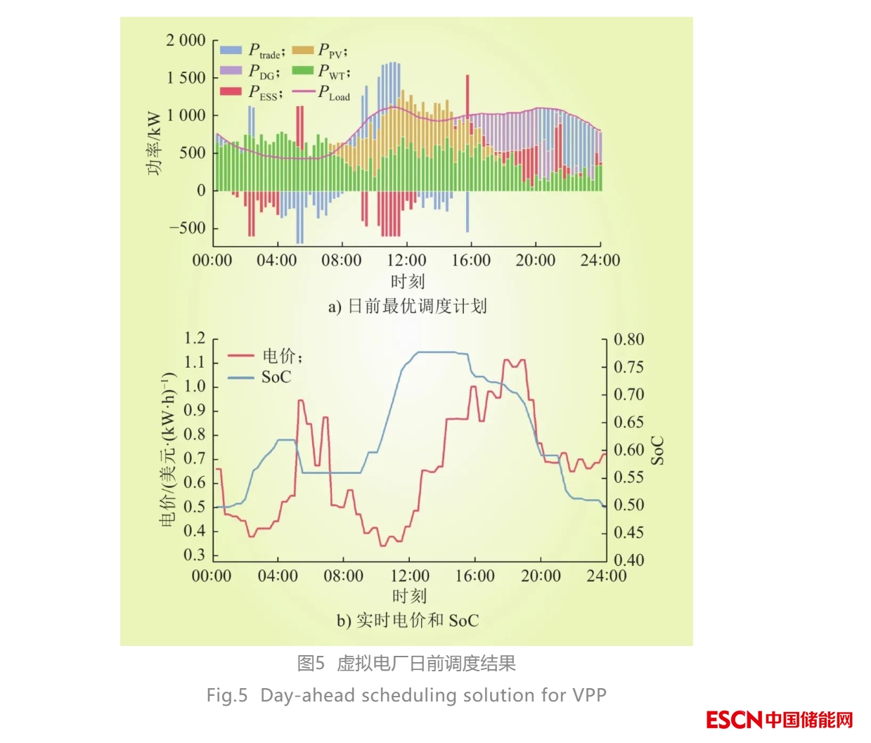 日前階段,虛擬電廠各個設(shè)備運行計劃如圖5 a)所示,日內(nèi)電價和儲能設(shè)備SoC變化如圖5 b)所示。