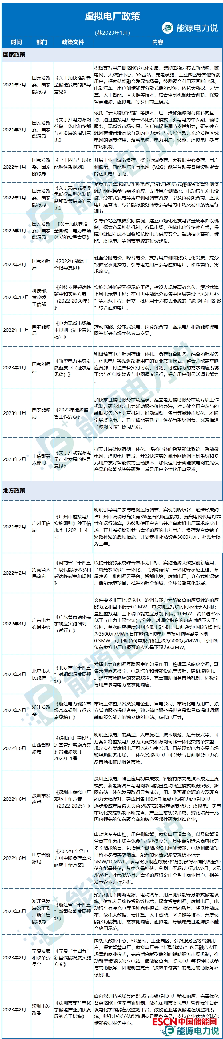 國家政策方面:去年11月,國家能源局發(fā)布《電力現(xiàn)貨市場基本規(guī)則(征求意見稿)》提出,推動儲能、分布式發(fā)電、負(fù)荷聚合商、虛擬電廠和新能源微電網(wǎng)等新興市場主體參與交易;今年1月,《新型電力系統(tǒng)發(fā)展藍(lán)皮書(征求意見稿)》提出培育負(fù)荷聚合服務(wù)、虛擬電廠等貼近終端用戶的新業(yè)態(tài)新模式,提升用戶側(cè)靈活調(diào)節(jié)能力;國家能源局將“引導(dǎo)虛擬電廠、新型儲能等新型主體參與系統(tǒng)調(diào)節(jié)”,寫入《2023年能源監(jiān)管工作要點(diǎn)》。