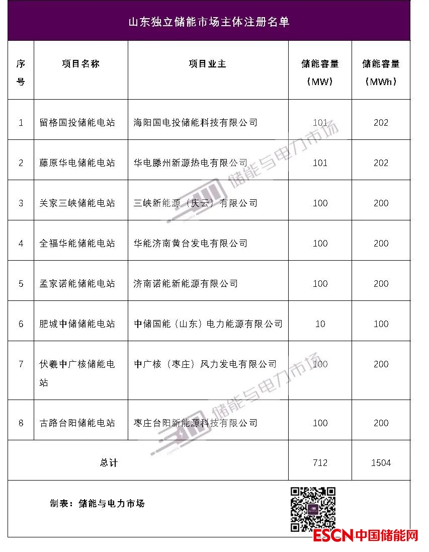 自2022年2月以來,山東電力交易中心累計公示五批獨立儲能主體注冊企業(yè),共8家市場主體,儲能電站總規(guī)模達到712MW/1504MWh。