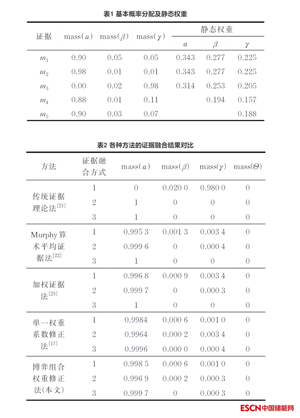 設(shè){α,β,γ}代表一個(gè)完整的辨識(shí)框架,m1,m2,…,m5代表證據(jù),每條證據(jù)在不同焦元α、β、γ上的概率分配如表1所示。以表1中的基本概率分配及對(duì)應(yīng)的靜態(tài)權(quán)重為例,分別采用本文所提的改進(jìn)方法與其他文獻(xiàn)中常見方法進(jìn)行證據(jù)融合,對(duì)比結(jié)果以驗(yàn)證本文改進(jìn)方法的有效性和優(yōu)越性。記m1⊕m2⊕m3、m1⊕m2⊕m3⊕m4與m1⊕m2⊕m3⊕m4⊕m5分別為證據(jù)融合方式1、證據(jù)融合方式2、證據(jù)融合方式3。各方法證據(jù)融合結(jié)果如表2所示。
