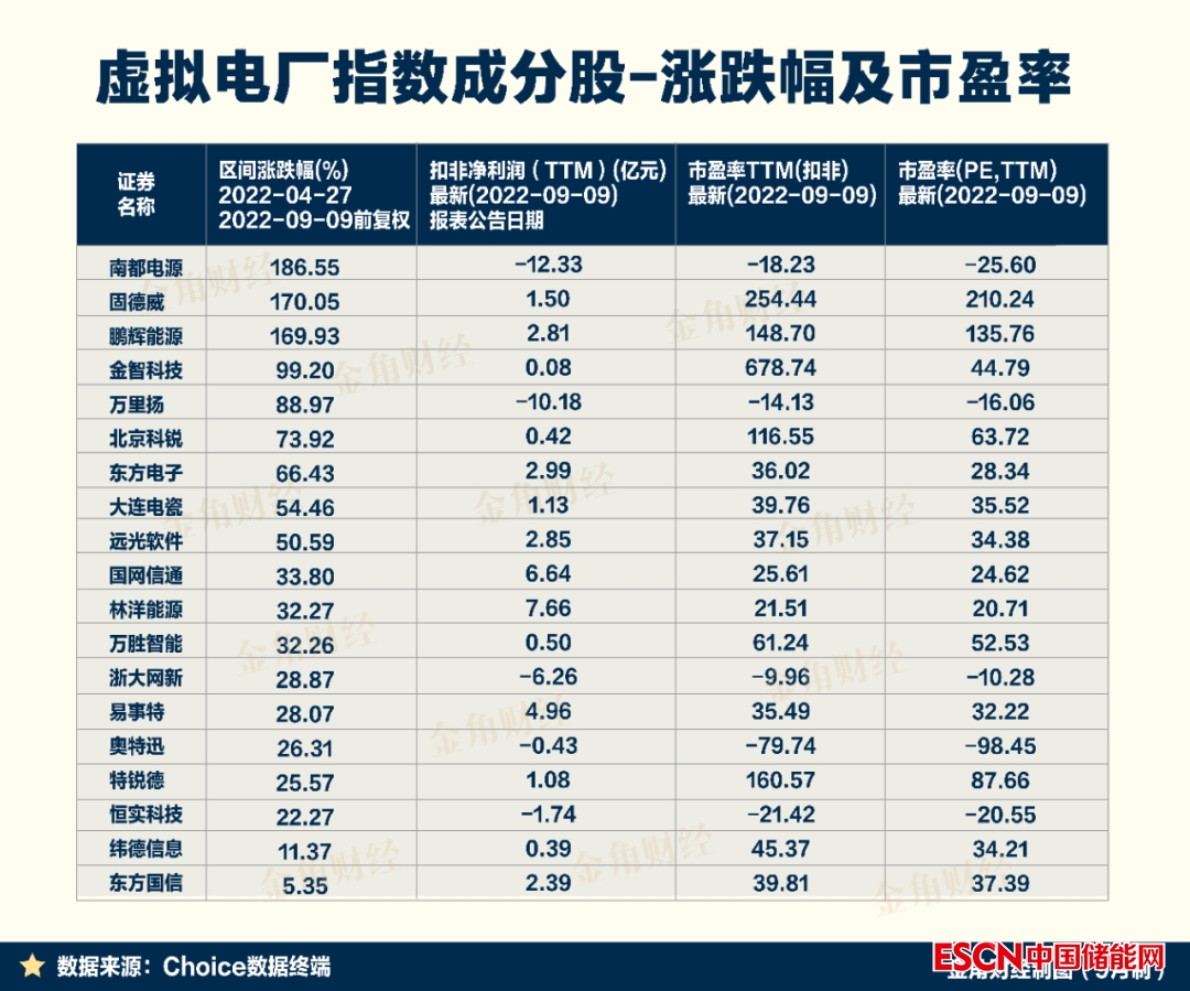 指數(shù)成分股中,4月27日至9月9日,有4個(gè)股票漲幅接近100%,包括南都電源(186%)、固德威(170%)、鵬輝能源(169%)和金智科技(99%)。