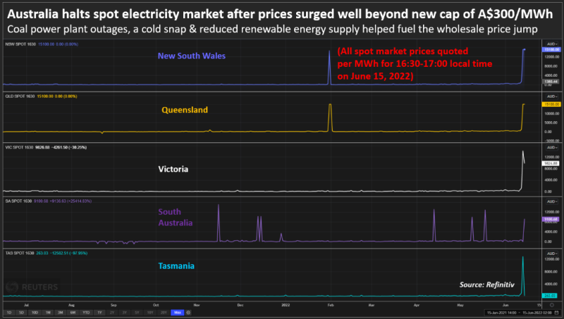此前的6月15日,AEMO發(fā)布公告,從澳大利亞東部標(biāo)準(zhǔn)時(shí)間14:05起暫停澳洲東部的電力現(xiàn)貨市場(chǎng),采取臨時(shí)價(jià)格機(jī)制出清,并對(duì)停運(yùn)期間進(jìn)入市場(chǎng)的合格發(fā)電商實(shí)行補(bǔ)償。這是澳大利亞首次暫停電力現(xiàn)貨市場(chǎng)運(yùn)行,事件引發(fā)業(yè)界熱議。