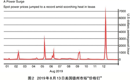 電力市場價格變化大是客觀經(jīng)濟(jì)規(guī)律。與石油、天然氣和煤炭等能源不同,電力產(chǎn)供用在瞬間同時完成,市場主體不能通過存貨調(diào)整供求平衡差異,現(xiàn)有的儲能電廠包括化學(xué)儲能不管在發(fā)電側(cè)、電網(wǎng)側(cè)還是用戶側(cè),在響應(yīng)瞬間平衡差異上都存在一定的時滯。在這種情況下,電價可能在瞬間上升很快和很高,如果發(fā)電側(cè)和用電側(cè)在15鐘甚至更短時間如5分鐘就可以響應(yīng),電價又會迅速回落,從而形成電力現(xiàn)貨市場特有的“價格釘(price spike)”,如圖2所示。由于電價瞬間很高是電力市場規(guī)律的客觀反映,國外政府、市場主體和公眾對短期或時段性很高的電價保持理性態(tài)度。美國德州現(xiàn)貨市場價格上限高達(dá)10美元/千瓦時,約是批發(fā)市場平均交易價格的100倍,并沒有引起不良反應(yīng)。事實上,從圖中可以看出,現(xiàn)貨市場電價雖然可以很高,但是,由于持續(xù)時間很短,很高電價產(chǎn)生的電費變化其實并不大。