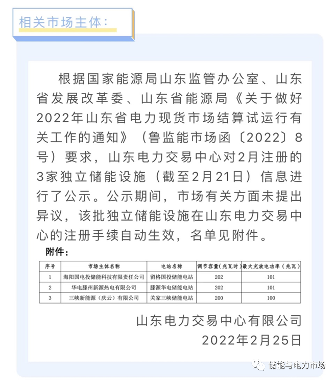2022年2月25日,山東省電力交易中心對外公示,海陽國電投儲能科技有限責任公司、華電滕州新源熱電有限公司、三峽新能源(慶云)有限公司運營的獨立儲能電站,正式成為山東省電力現貨交易市場的主體。