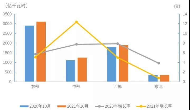 10月份,東、中、西部和東北地區(qū)全社會用電量增速分別為5.1%、12.3%、5.0%和0.8%。
