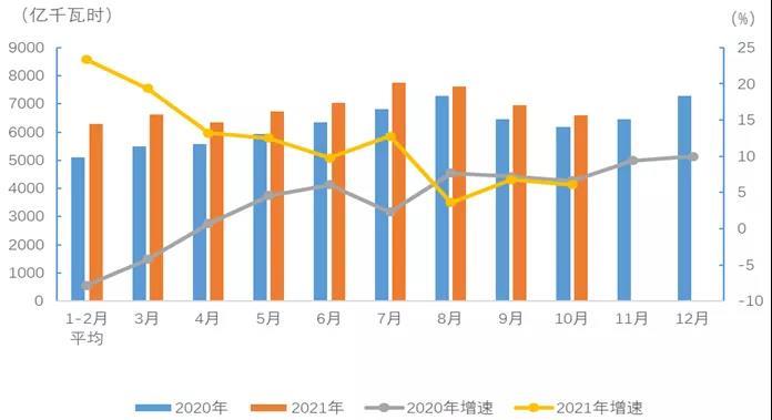 圖1 2020、2021年分月全社會用電量及其增速