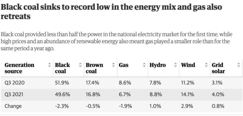 電網(wǎng)規(guī)模的風(fēng)能和太陽能發(fā)電裝機在本季度達到新高,從6月份的118MW增加到9月份的351MW,增長了三倍。風(fēng)能、太陽能和水力發(fā)電廠提供了全國電力市場近三分之一的電力需求,達到創(chuàng)紀錄的31.7%。在9月24日的一個30分鐘時段內(nèi),可再生能源滿足了61.4%的需求——也創(chuàng)下新高。同時,沒有莫里森政府大肆吹噓的“天然氣帶動的復(fù)蘇”跡象,維多利亞州朗福德天然氣廠的供應(yīng)中斷最初導(dǎo)致阿德萊德、悉尼和墨爾本化石燃料現(xiàn)貨價格創(chuàng)紀錄或接近紀錄。天然氣在整個季度的電力結(jié)構(gòu)中所占份額也較上年同期下降了五分之一;硬煤發(fā)電比例也首次降至50%以下。