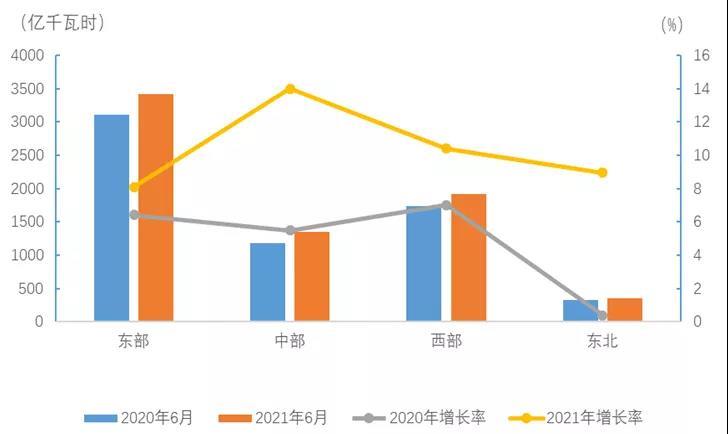 6月份,東、中、西部和東北地區(qū)全社會用電量增速分別為8.1%、14.0%、10.4%和9.0%。