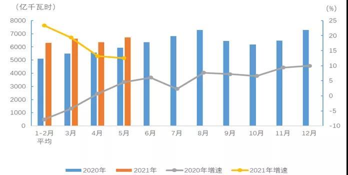1-5月,全國全社會(huì)用電量32305億千瓦時(shí),同比增長17.7%,其中,5月份全國全社會(huì)用電量6724億千瓦時(shí),同比增長12.5%。
