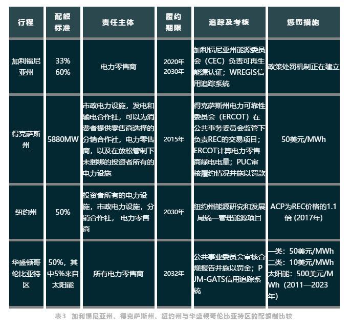 我們選取了加利福尼亞州、得克薩斯州、紐約州和華盛頓哥倫比亞特區(qū),對這幾個地區(qū)的配額制機制進行了總結(jié)和比較。這四個地區(qū)的配額制各有特色。加利福尼亞州由于管制市場與放松管制市場并存,配額制機制較為復(fù)雜;得克薩斯州的配額制具有周密的制度設(shè)置和配套的支持措施,如稅收優(yōu)惠和財政補貼,因此被認(rèn)為是美國配額制的模板;紐約州是唯一一個采用政府統(tǒng)購模式實行配額制的州,并且于2016年起實施了新的清潔能源配額制;華盛頓哥倫比亞特區(qū)除總體的配額之外,還對太陽能發(fā)電的比重設(shè)定了目標(biāo)。