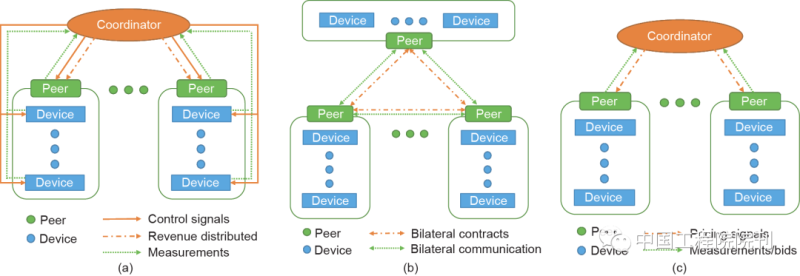 分布式市場是一種介于集中式市場和分散式市場之間的市場機制。與集中式市場的協(xié)調者直接控制用戶的能源輸入/輸出量或直接控制用戶設備不同,分布式市場的協(xié)調者往往通過價格信號間接影響用戶的行為。與完全分散式市場相比(如與文獻相比),分布式市場具有一個市場協(xié)調者,因此用戶的用電行為可以得到更好的協(xié)調。與集中式市場相比(如與文獻相比),分布式市場往往需要更少的量測數(shù)據(jù),并且也不直接控制用戶設備,因此可以更好地保障用戶的隱私和自治性??傊植际绞袌鼋Y合了集中式市場和分散式市場的特點,是一種居中的解決方法。