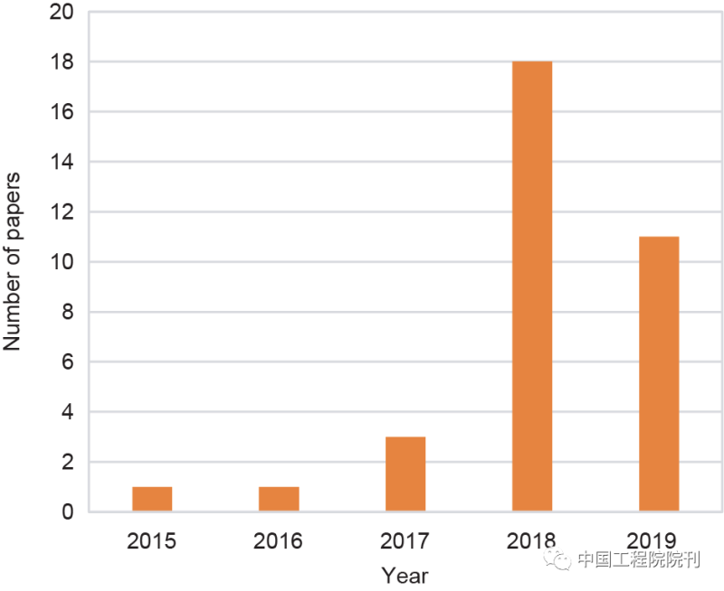 圖1 端對端能源交易相關期刊論文統(tǒng)計(按年)。2019年的論文數(shù)量截至2019年3月底