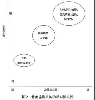 總而言之,要做到獨(dú)立的第三方必須滿足三個(gè)核心條件:財(cái)務(wù)、人事和決策獨(dú)立。首先,監(jiān)測(cè)部門的預(yù)算不能由被監(jiān)測(cè)者決定。如果監(jiān)測(cè)人員的“飯碗”由某些被監(jiān)測(cè)者控制,監(jiān)測(cè)的結(jié)果自然會(huì)有利于該被監(jiān)測(cè)者,對(duì)其他被監(jiān)測(cè)者不利。在北美市場(chǎng),盡管“第三方”監(jiān)測(cè)的收入由交易和調(diào)度機(jī)構(gòu)向市場(chǎng)用戶征收,但收入要求是通過(guò)公開招標(biāo)或競(jìng)標(biāo)完成的,或由公共事務(wù)委員會(huì)確定。其次,監(jiān)測(cè)人員不能由被監(jiān)測(cè)者指定,尤其是主要負(fù)責(zé)人。主要負(fù)責(zé)人通常由監(jiān)管機(jī)構(gòu)比如地方公共事業(yè)委員會(huì)或交易和調(diào)度中心董事會(huì)指定,有較長(zhǎng)的任期(比如阿爾伯塔是五年,PJM的合同為期6年)。即使是在不太獨(dú)立的SPP,監(jiān)測(cè)部門主要負(fù)責(zé)人的考核和績(jī)效獎(jiǎng)勵(lì)也由相對(duì)獨(dú)立的SPP董事會(huì)確定,而不是SPP管理層。第三,獨(dú)立性最為核心的關(guān)鍵點(diǎn)是監(jiān)測(cè)機(jī)構(gòu)必須有獨(dú)立決策權(quán),可以自己決定監(jiān)測(cè)什么、公開什么或調(diào)查什么,任何個(gè)人或機(jī)構(gòu)無(wú)權(quán)更改和審查監(jiān)測(cè)報(bào)告。圖2展示了北美“第三方”監(jiān)測(cè)機(jī)構(gòu)的相對(duì)獨(dú)立性。與其他幾個(gè)市場(chǎng)相比,SPP、加利福尼亞、新英格蘭和安大略省的獨(dú)立性較低一些,因?yàn)檫@幾個(gè)市場(chǎng)都由內(nèi)部監(jiān)測(cè)部門負(fù)責(zé)日常監(jiān)測(cè),或多或少地受到雇主交易和調(diào)度中心的影響。