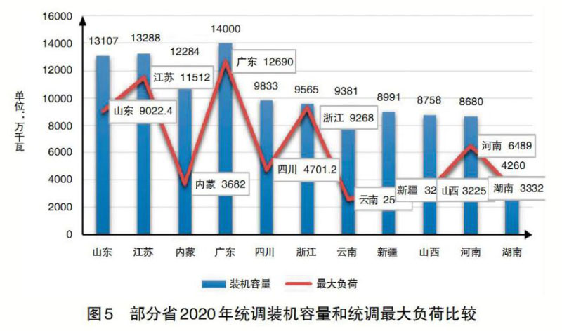 電力電量是電力供求的動態(tài)平衡,需要從兩個方面同時著手,才會有更好的效果。從供給側(cè)的角度,隨著特高壓電網(wǎng)的建設(shè),跨省跨區(qū)交易電量大幅度增加,不能把省外電力交易作為邊界條件后再進(jìn)行省內(nèi)電力電量平衡,要把省外交易納入本省電力供求,增加經(jīng)濟(jì)性原則,統(tǒng)籌優(yōu)化省內(nèi)電力電量平衡。根據(jù)《廣東省電力市場2019年年度報告》,2019年全省電網(wǎng)統(tǒng)調(diào)裝機(jī)容量1.26億千瓦,電網(wǎng)統(tǒng)調(diào)最大負(fù)荷1.22億千瓦;全省發(fā)受電量6581.6億千瓦時,其中受電量1970.9億千瓦時。與廣東省統(tǒng)調(diào)裝機(jī)容量與電網(wǎng)統(tǒng)調(diào)最大負(fù)荷十分相近比較,有些電力受入省的統(tǒng)調(diào)裝機(jī)容量明顯大于統(tǒng)調(diào)最大負(fù)荷;盡管不能簡單地斷定這些超出容量的固定成本和運(yùn)行維護(hù)費(fèi)就是多余的電力電量平衡成本,但是,至少提出了更大范圍優(yōu)化平衡成本的問題。圖5比較了截至2020年10月部分省統(tǒng)調(diào)裝機(jī)容量和統(tǒng)調(diào)最大負(fù)荷,其中有些電力受入省的統(tǒng)調(diào)裝機(jī)容量和統(tǒng)調(diào)最大負(fù)荷差值得關(guān)注。
