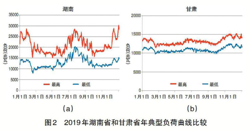 根據(jù)國家發(fā)改委公布的2019年各省級電網(wǎng)典型負(fù)荷曲線,各省都存在明顯的日最大負(fù)荷與最小負(fù)荷差,有些省相對較大,如湖南省全年的日最大負(fù)荷與最小負(fù)荷差約1倍左右,如圖2(a)所示;有些相對較小,如圖2(b)所示,甘肅省全年日最大負(fù)荷與最小負(fù)荷差約在0.5左右。