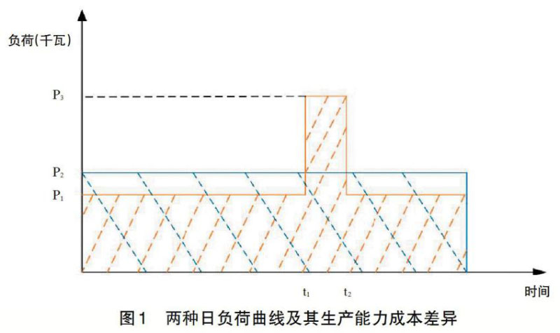 從用戶支付電費(fèi)或發(fā)電企業(yè)獲得銷售收入的角度,在目前我國電力市場改革和電價政策背景下,電力現(xiàn)貨市場改革還僅停留在試點(diǎn)階段,僅有大工業(yè)用電按兩部制付費(fèi),并且容量電費(fèi)的比例較低,可以認(rèn)為,目前我國電費(fèi)主要按電量支付。實(shí)際生產(chǎn)和消費(fèi)的是電力,而電費(fèi)支付卻以電量為依據(jù),這樣就產(chǎn)生了矛盾。如圖1所示,圖中有兩條簡化的日負(fù)荷曲線,第一條日負(fù)荷曲線負(fù)荷率為100%,日負(fù)荷24小時內(nèi)始終為P2;第二條日負(fù)荷曲線由三段水平負(fù)荷組成,最高負(fù)荷為P3,平段負(fù)荷為P1。假設(shè)兩條曲線下的面積即電量相等,即用戶支付的電費(fèi)相同,這樣,P2相當(dāng)于第二條負(fù)荷曲線的平均負(fù)荷。假設(shè)P3為P1的2倍,t1-t2=2小時,同時忽略大工業(yè)用電中的容量電費(fèi)。在兩條不同的日負(fù)荷曲線下,用戶消費(fèi)的電能商品和支付的電費(fèi)相同,但是,電力企業(yè)生產(chǎn)電能的成本卻完全不同。由于電力企業(yè)的投資成本與最大負(fù)荷水平成正比例關(guān)系,第二條日負(fù)荷曲線下電力企業(yè)的投資成本根據(jù)上面的假設(shè),可以計算是第一條負(fù)荷曲線的投資成本的1.85倍(2×24/26)。由于電力工業(yè)資本密集,1.85倍投資成本差異巨大。這個結(jié)果說明了兩個重要結(jié)論:第一,由于這種成本的差異源于不同的負(fù)荷曲線或者電力分布,因此,電力企業(yè)生產(chǎn)和用戶消費(fèi)的電能商品其實(shí)不是電量而是電力。第二,存在基于負(fù)荷曲線的成本最小的最優(yōu)電力生產(chǎn)和消費(fèi)的問題,從圖1中可以直觀地看出,電力負(fù)荷曲線越平緩,或者說最大負(fù)荷與最小負(fù)荷差越小,電力生產(chǎn)與消費(fèi)就越經(jīng)濟(jì)。圖1中第一條負(fù)荷曲線能夠?qū)崿F(xiàn)最小投資成本的生產(chǎn)和消費(fèi)。通過調(diào)整用戶的用電負(fù)荷分布,比如將第二條負(fù)荷曲線調(diào)整為第一條或者接近于第一條負(fù)荷曲線,可以相對減少電力企業(yè)的投資成本,在電力企業(yè)利益不變的前提下降低電價。