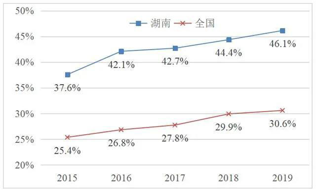 圖2 三產(chǎn)和生活的用電占比(湖南和全國(guó))