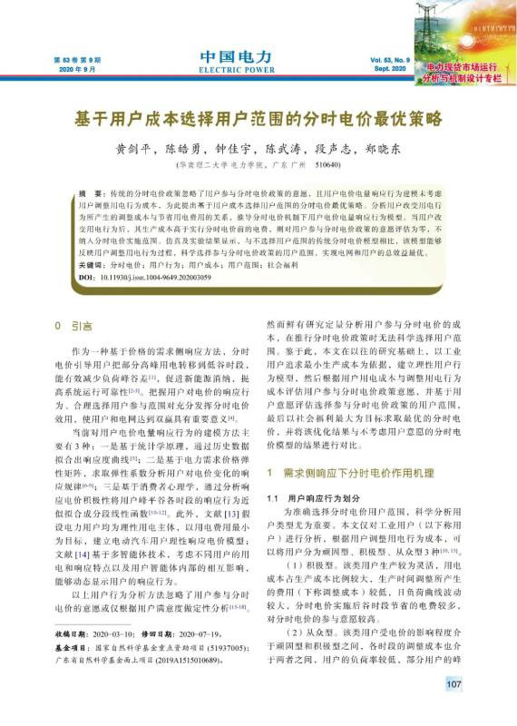 傳統(tǒng)的分時電價政策忽略了用戶參與分時電價政策的意愿,且用戶電價電量響應(yīng)行為建模未考慮用戶調(diào)整用電行為成本,為此提出基于用戶成本選擇用戶范圍的分時電價最優(yōu)策略。分析用戶改變用電行為所產(chǎn)生的調(diào)整成本與節(jié)省用電費用的關(guān)系,推導(dǎo)分時電價機(jī)制下用戶電價電量響應(yīng)行為模型。當(dāng)用戶改變用電行為后,其生產(chǎn)成本高于實行分時電價前的電費,則對用戶參與分時電價政策的意愿評估為零,不納入分時電價實施范圍。仿真及實驗結(jié)果顯示,與不選擇用戶范圍的傳統(tǒng)分時電價模型相比,該模型能夠反映用戶調(diào)整用電行為過程,科學(xué)選擇參與分時電價政策的用戶范圍,實現(xiàn)電網(wǎng)和用戶的總效益最優(yōu)。