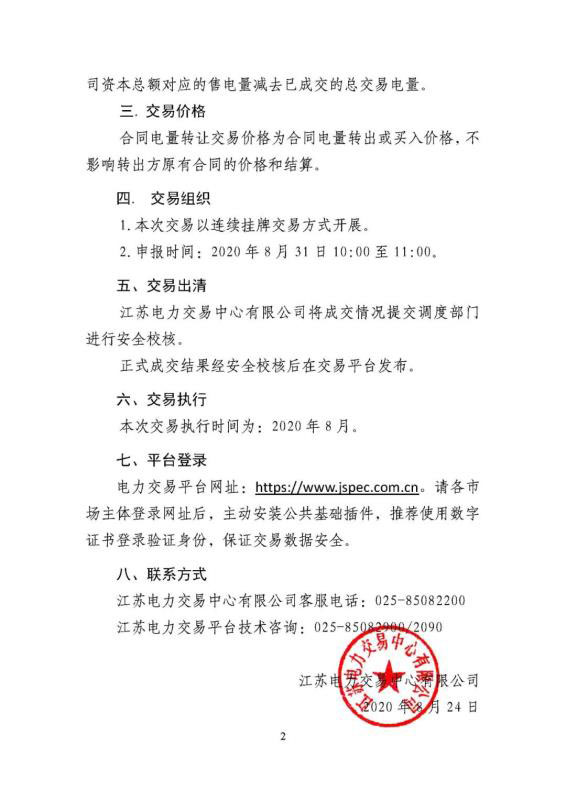 2020年8月江蘇電力市場(chǎng)購(gòu)電側(cè)月內(nèi)合同電量轉(zhuǎn)讓交易公告
