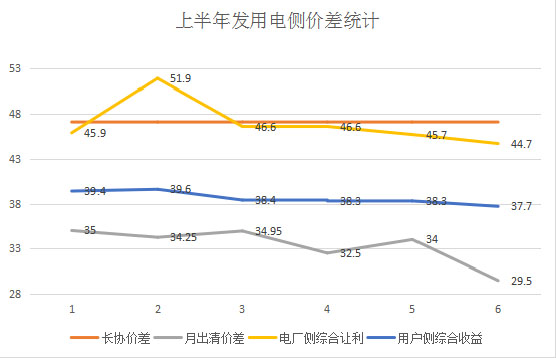 上半年月度競(jìng)價(jià)交易總電量占比不到10%,價(jià)差相對(duì)穩(wěn)定,總體上(絕對(duì)值數(shù)據(jù))呈下降態(tài)勢(shì),從1月份的-35厘/千瓦時(shí)到6月份的-29.5厘/千瓦時(shí),與市場(chǎng)預(yù)期基本一致。從上半年的數(shù)據(jù)來看,綜合長(zhǎng)協(xié)和月度競(jìng)價(jià)情況,電廠和用戶側(cè)度電價(jià)差基本上穩(wěn)定在平均值(-46.41厘/千瓦時(shí)和-38.45厘/千瓦時(shí))附近,雖然2月份電廠讓利幅度較大,超過50厘/千瓦時(shí),原因主要是電廠偏差電量考核所致,用戶側(cè)受購(gòu)售電合同價(jià)格已固化價(jià)差收益,所以收益未有明顯變化。