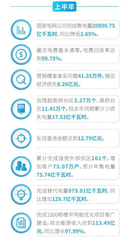 據(jù)統(tǒng)計(jì),上半年公司經(jīng)營(yíng)區(qū)域內(nèi)業(yè)擴(kuò)報(bào)裝容量完成2.4億千伏安,結(jié)存容量占比較年初下降10.6個(gè)百分點(diǎn),業(yè)擴(kuò)增供電量達(dá)到327億千瓦時(shí);累計(jì)完成接受外部供區(qū)161個(gè),增加客戶75.07萬戶,預(yù)計(jì)年售電量75.74億千瓦時(shí);完成替代電量979.91億千瓦時(shí),同比增加129.7億千瓦時(shí);完成1000棟樓宇用能優(yōu)化項(xiàng)目推廣建設(shè),綜合能源收入達(dá)到113.49億元,同比增長(zhǎng)97.99%。其中,國(guó)網(wǎng)山東、江蘇電力電能替代電量超過100億千瓦時(shí),綜合能源收入超過10億元。