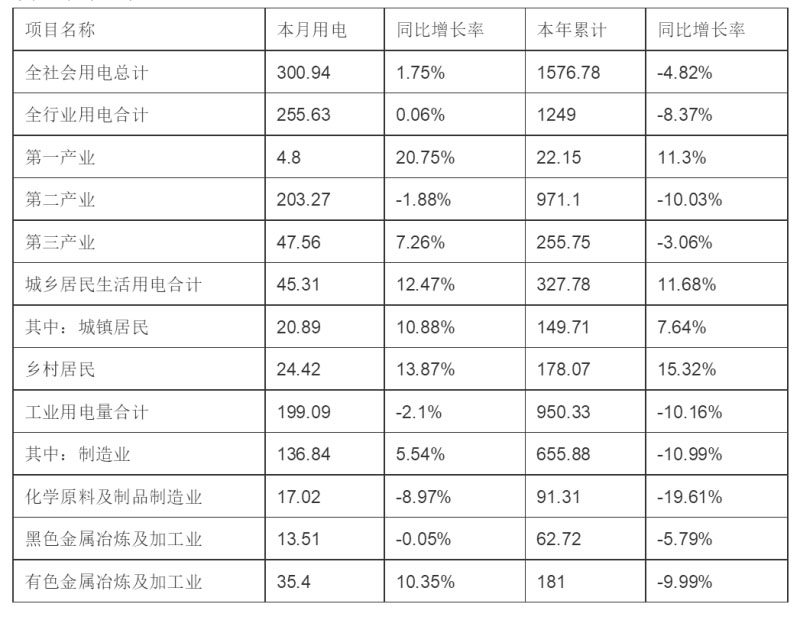 (一)全社會用電量情況。全省全社會用電量300.94億千瓦時,同比增加1.75%;累計用電量1576.78億千瓦時,同比減少4.82%。