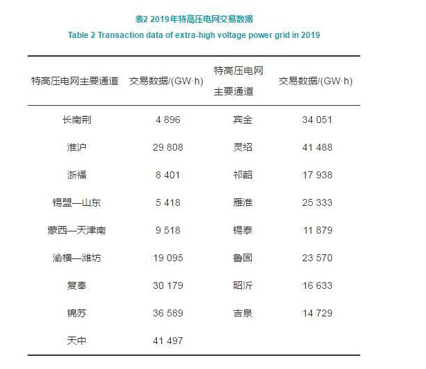 3)全面形成全國(guó)聯(lián)網(wǎng)格局,為全國(guó)電力市場(chǎng)建設(shè)奠定物理基礎(chǔ)。目前中國(guó)已基本形成以特高壓電網(wǎng)為骨干網(wǎng)架、各級(jí)電網(wǎng)協(xié)調(diào)發(fā)展的堅(jiān)強(qiáng)國(guó)家電網(wǎng),跨區(qū)跨省輸電能力突破200 GW,形成全國(guó)聯(lián)網(wǎng)格局,為電力市場(chǎng)建設(shè)奠定了堅(jiān)強(qiáng)的物質(zhì)基礎(chǔ),表2列舉了2019年特高壓電網(wǎng)主要通道的交易數(shù)據(jù)。