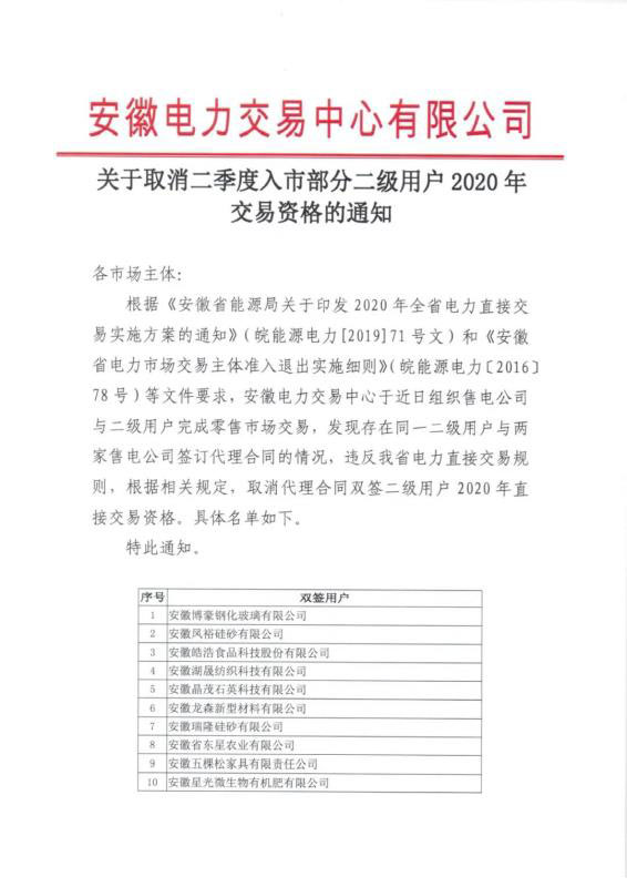 這一行政通知發(fā)布于安徽電力交易中心官方網(wǎng)站,全名《關(guān)于取消二季度入市部分二級用戶2020年交易資格的通知》(下文簡稱《取消通知》(見下圖通知全文)。據(jù)悉,這23家用戶被取消今年交易資質(zhì)的真正原因是“雙簽” ——即與兩家售電公司同時簽訂代理合同,同時提交給交易中心。