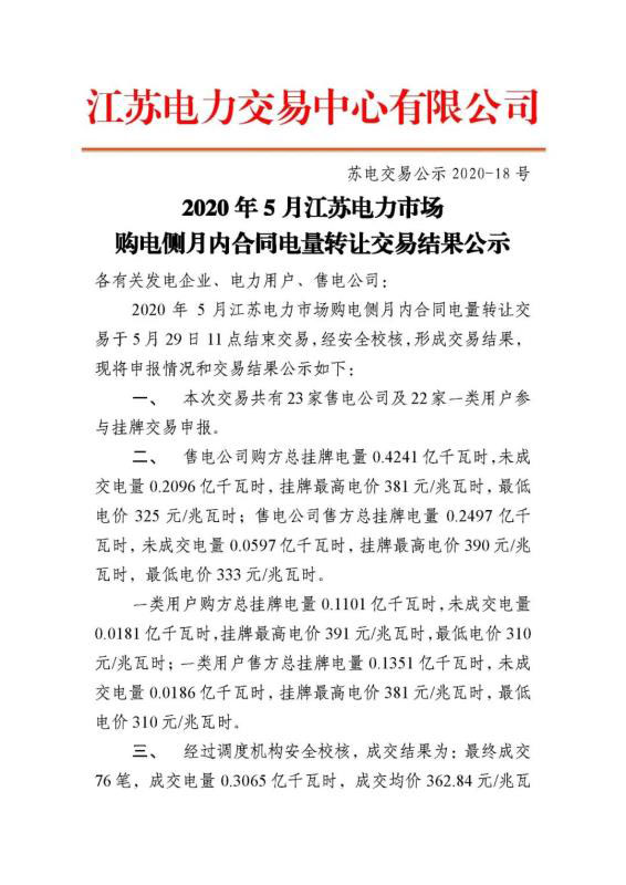 2020年5月江蘇電力市場購電側(cè)月內(nèi)合同電量轉(zhuǎn)讓交易結(jié)果公示
