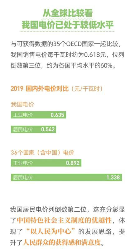從全球比較來看,我國電價已經(jīng)處于較低水平,與可獲得數(shù)據(jù)的35個OECD國家一起比較,我國銷售電價每千瓦時約0.618元,位列倒數(shù)第三位,約為各國平均水平的60%。