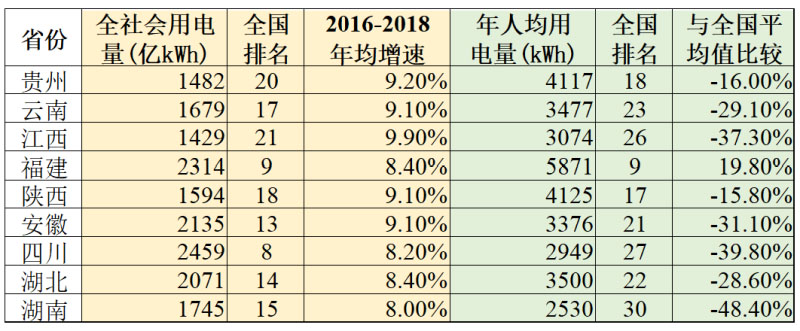 2015至2018年,我國電力消費(fèi)彈性系數(shù)從0.42增長到1.29,地方經(jīng)濟(jì)發(fā)展對電能保障的依賴性日益強(qiáng)化。廣東、江蘇、山東、浙江既是GDP前四省份,也是全國用電量前四大省,且保持了一定用電增速。貴州、云南、江西、福建、陜西、安徽、四川、湖南、湖北等GDP增長較快(超過7.5%)省份,近年用電量增速均超過8%(全國均值7.5%)。電能對這些省份經(jīng)濟(jì)發(fā)展的保障作用更加突出。