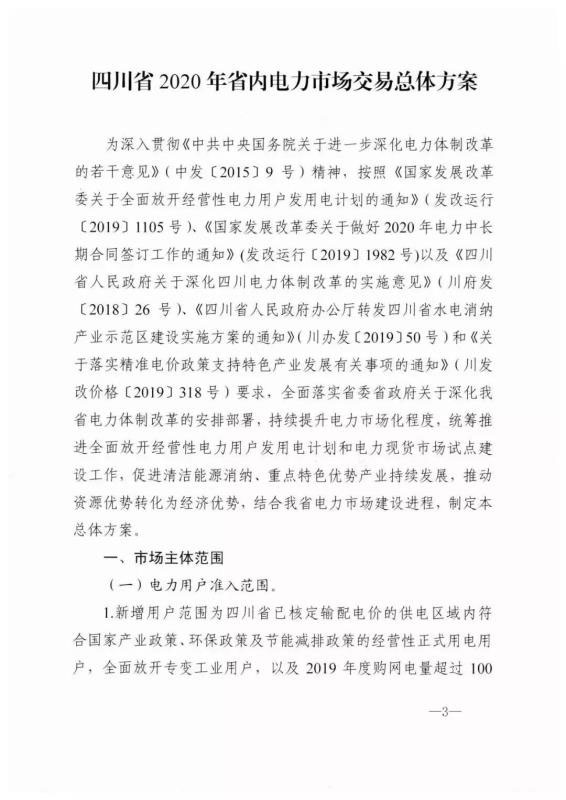 (一)新增用戶范圍為四川省已核定輸配電價的供電區(qū)域內(nèi)符合國家產(chǎn)業(yè)政策、環(huán)保政策及節(jié)能減排政策的經(jīng)營性正式用電用戶,全面放開專變工業(yè)用戶,以及2019年度購網(wǎng)電量超過100萬千瓦時的一般工商業(yè)及其他專變用戶。