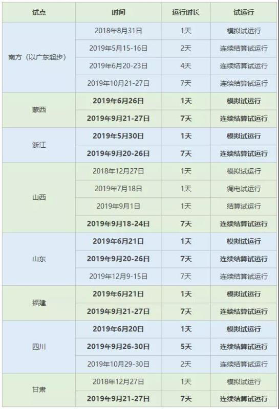 但是,在2018年底的時間節(jié)點(diǎn)上,僅有南方(以廣東起步)、山西和甘肅3個試點(diǎn)完成了為期一天的模擬試運(yùn)行。除了南方(以廣東起步)是在當(dāng)年的8月31日完成的模擬試運(yùn)行,山西和甘肅都是在12月27日完成的,而剩余5個試點(diǎn)完成這一步已經(jīng)至少是半年后的事情了。