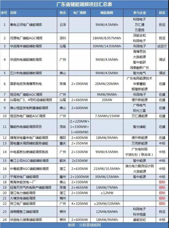 自2018年9月1日期,《廣東調(diào)頻輔助服務(wù)市場交易規(guī)則(試行)》執(zhí)行以來,廣東儲(chǔ)能調(diào)頻市場發(fā)展火熱,到目前為止招標(biāo)、在建及投運(yùn)的儲(chǔ)能調(diào)頻項(xiàng)目已有20余個(gè)。如圖所示: