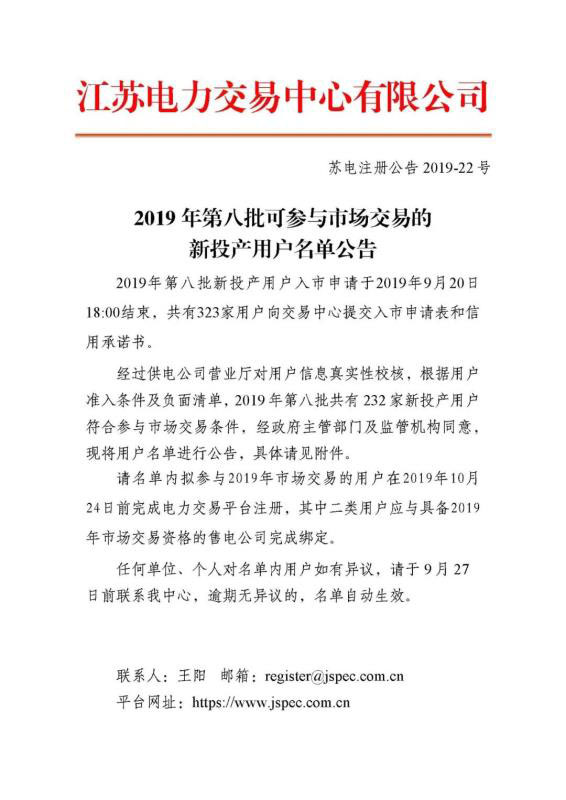中國(guó)儲(chǔ)能網(wǎng)訊:江蘇電力交易中心于2019年9月26日發(fā)布了2019年第八批可參與市場(chǎng)交易的新投產(chǎn)用戶名單公告。